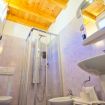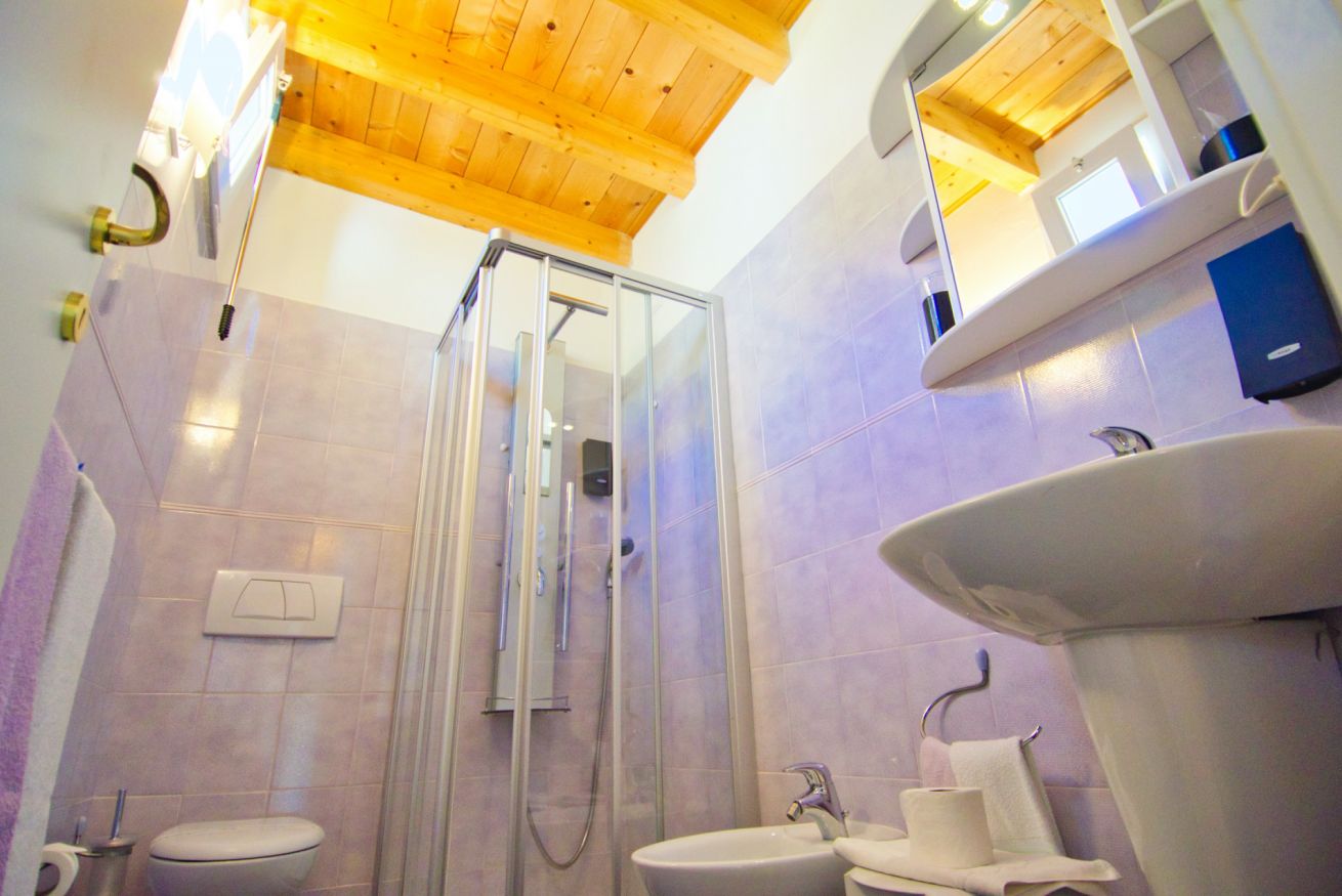 Bagno elegante, dotato di confortevole box doccia con idromassaggio e asciugacapelli.